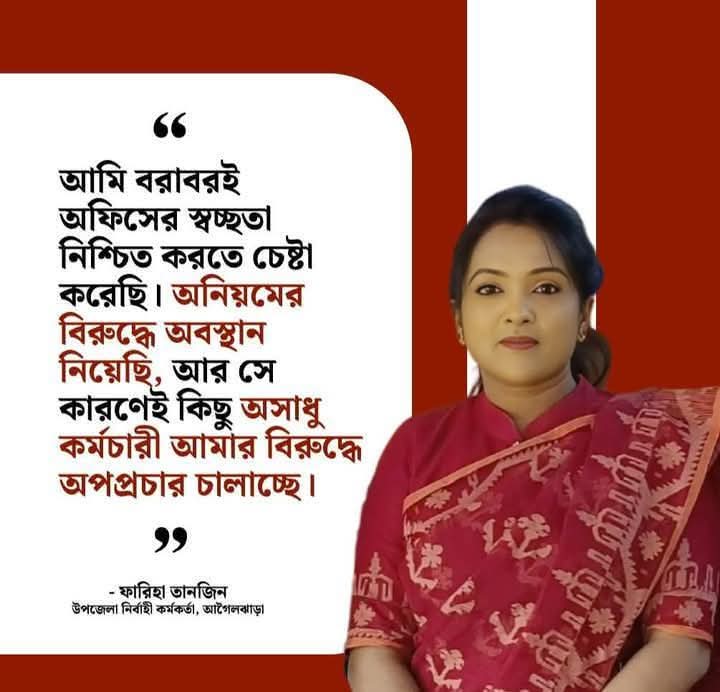 সামাজিক যোগযোগ মাধ্যমে আগৈলঝাড়া উপজেলা নির্বাহি কর্মকর্তা ও এক্সিকিউটিভ ম্যাজিস্ট্রেট ফারিহা তানজিনকে নিয়ে নানান অপপ্রচার চালাচ্ছেন বলেও অভিযোগ। অফিস পিওনসহ তিন কর্মচারীদের এমন কাণ্ডে উপজেলা ছাপিয়ে জেলা জুড়ে ব্যাপক তোলপাড় শুরু হয়েছে।
