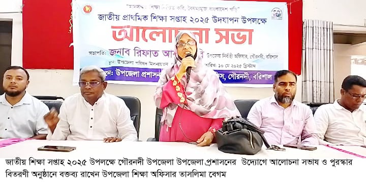 গৌরনদী প্রতিনিধিঃ-জাতীয় শিক্ষা সপ্তাহ ২০২৫ উপলক্ষে গৌরনদী উপজেলা প্রাথমিক শিক্ষা অফিস ও উপজেলা প্রশাসনের যৌথ উদ্যোগে বিভিন্ন প্রাথমিক শিক্ষা প্রতিষ্ঠানের শিক্ষার্থীদের মাঝে সুন্দর হাতের লেখা প্রতিযোগিতা, চিত্রাংকন প্রতিযোগিতা, আবৃত্তি ও সাংস্কৃতিক প্রতিযোগিতার আয়োজন করা হয়। উপলক্ষে সকাল ১১ টায় উপজেলা পরিষদ মিলনায়তনে আলোচনা সভায় ও পুরস্কার বিতরণী অনুষ্ঠানে সভাপতিত্ব করেন গৌরনদী উপজেলা শিক্ষা অফিসার তাসলিমা বেগম।
