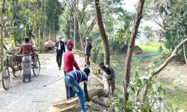 মাদারীপুরের ডাসার উপজেলার ধুলগ্রামের রাস্তা ও খালের পাড় থেকে গাছ কেটে নিচ্ছে স্থানীয় আহম্মদ, মোহাম্মদ ও খলিল নামের স্থানীয় তিন প্রভাবশালী ব্যক্তিরা। রাস্তাটি ইউনিয়ন ভূমি অফিসের ৫ শ গজের মধ্যে হলেও সরকারি রাস্তার গাছ কেটে নেওয়ায় কোন ব্যবস্থা নিচ্ছেনা ভূমি তহশিলদার কবির হোসেন।