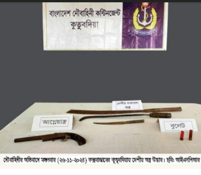 এ সময় তল্লাশী চালিয়ে ০১ টি এক নলা বন্দুক, ০২ রাউন্ড তাজা গোলা ও ০৩ টি দেশীয় ধারালো অস্ত্র উদ্ধার করা হয়। উদ্ধারকৃত অস্ত্র ও গোলাবারুদ পরবর্তী আইনি পদক্ষেপের জন্য কুতুবদিয়া থানায় হস্তান্তর করা হয়েছে। উল্লেখ্য, বাংলাদেশ নৌবাহিনীর দায়িত্বপূর্ণ এলাকাসমূহে আইনশৃঙ্খলা পরিস্থিতি নিয়ন্ত্রণে নিয়মিত টহল ও অভিযান পরিচালনা চলমান থাকবে।