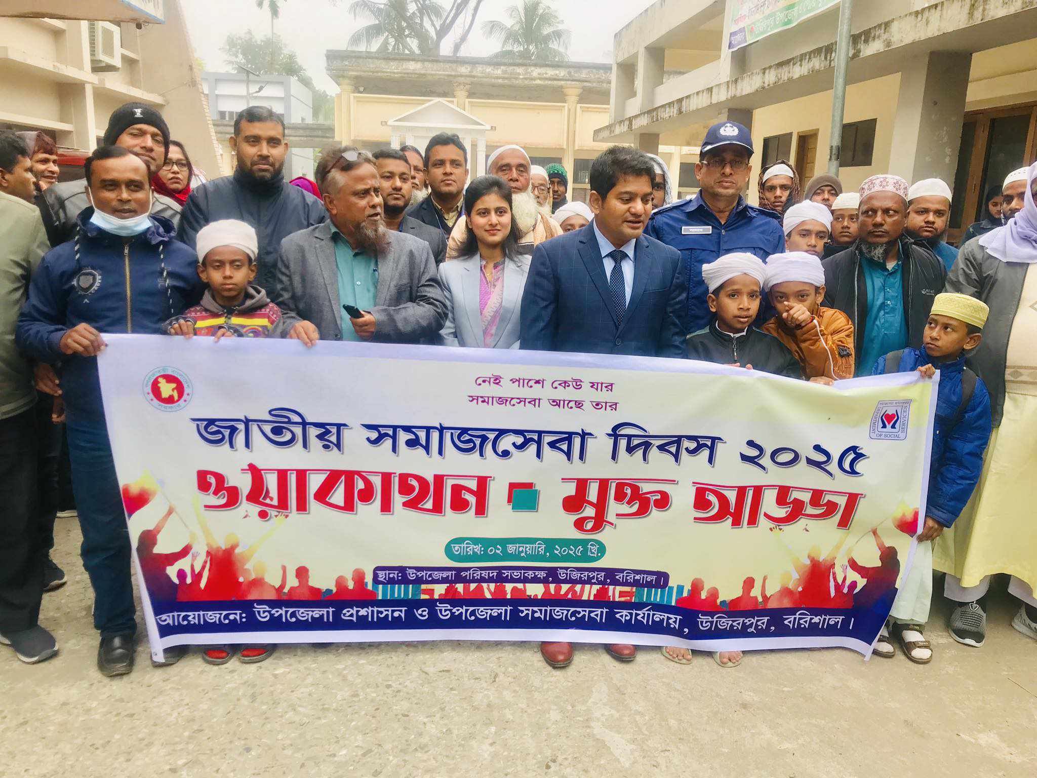 বরিশাল জেলার উজিরপুরে ব্যাপক আয়োজনে জাতীয় সমাজ সেবা দিবস পালিত হয়েছে। ২ জানুয়ারী বৃহস্পতিবার সকাল ১১ টায় উপজেলা প্রশাসন ও সমাজ সেবা অফিসের আয়োজনে ওয়াকাথন ও মুক্ত আড্ডা অনুষ্ঠিত হয়েছে। প্রধান অতিথি হিসেবে অনুষ্ঠানের উদ্ভোধন করেন উপজেলা নির্বাহী কর্মকর্তা মোঃ আলী সুজা। এ উপলক্ষে পায়ে হেঁটে ওয়াকাথনে অংশ গ্রহণ করেন উপস্থিত অতিথিবৃদ্ধ। মুক্ত আড্ডায় উপজেলা সভাকক্ষে উপজেলা সমাজ সেবা কর্মকর্তা মোঃ আবুল কালাম আজাদের সভাপতিত্বে প্রধান অতিথির বক্তৃতা করেন উপজেলা নির্বাহী কর্মকর্তা মোঃ আলী সুজা। বিশেষ অতিথির বক্তৃতা করেন উপজেলা সহকারী কমিশনার (ভুমি) হাসনাত জাহান খাঁন, মডেল থানার অফিসার ইনচার্জ মোঃ আব্দুস সালাম। অন্যান্যদের মধ্যে উপস্থিত ছিলেন উপজেলা যুব উন্নয়ন কর্মকর্তা আসমা বেগম, মহিলা বিষয়ক কর্মকর্তা কাজী ইশরাত জাহান, মেরিন ফিসারিজ কর্মকর্তা মাহাবুব হোসেন, পল্লী সঞ্চয় ব্যাংক ম্যানেজার সমির চন্দ্র হাওলাদার, বীর মুক্তিযোদ্ধা আক্রাম হোসেন, উপজেলা জামায়াতে ইসলামীর সাবেক আমির মাওলানা কাওসার হোসেন, বীর মুক্তিযোদ্ধা আলমগীর হাওলাদার, উজিরপুর সাংবাদিক ইউনিয়নের সভাপতি আঃ রহিম সরদার, সাধারণ সম্পাদক মোঃ মাহফুজুর রহমান মাসুম, গুঞ্জন সংগীত একাডেমির পরিচালক মোঃ ফরিদ হোসেন রানা, পূর্ব ধামসর নুরানি হাফেজী মাদ্রাসা