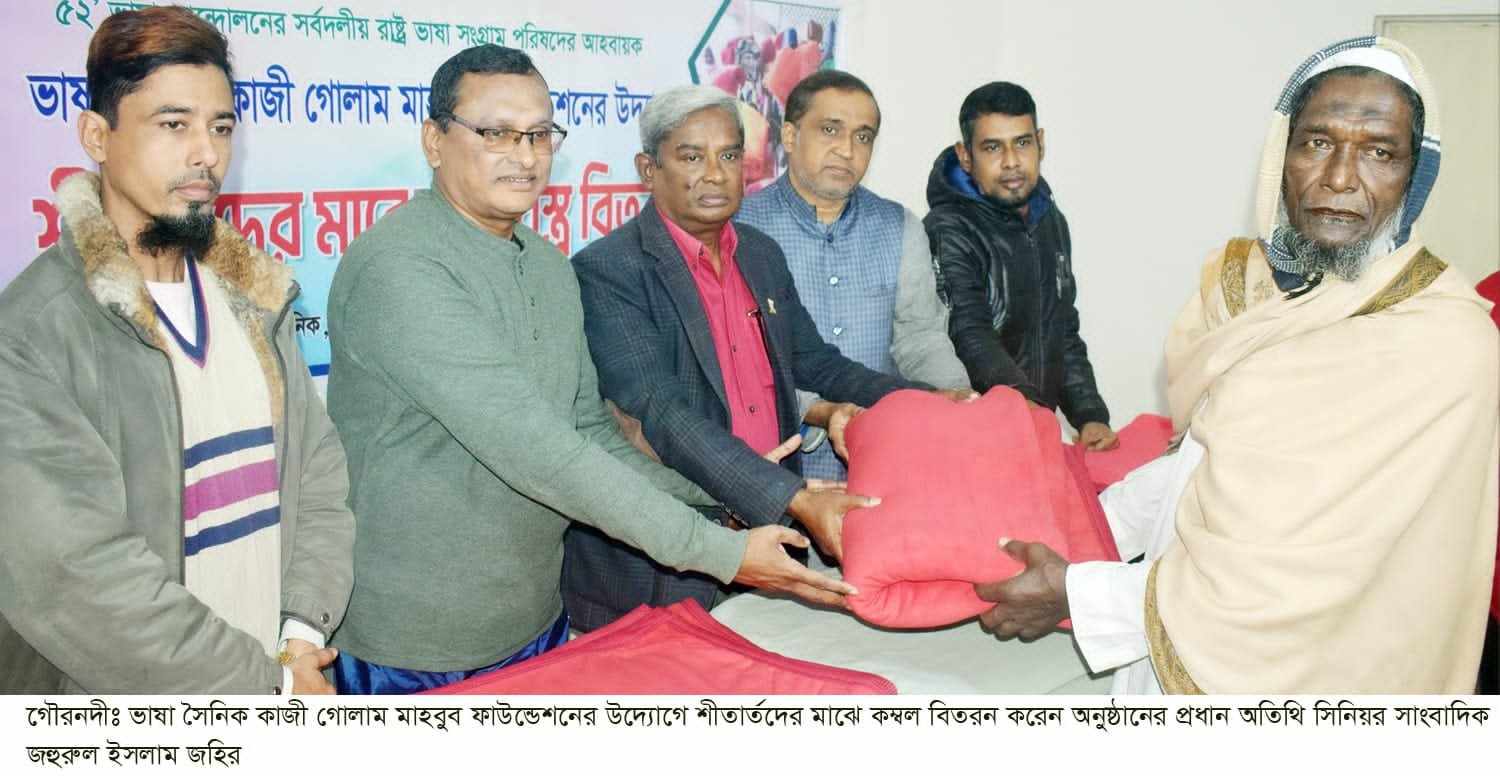 ভাষা সৈনিক কাজী গোলাম মাহবুব ফাউন্ডেশনের উদ্যোগে শনিবার সকালে টরকী নীলখোলা আছিয়া চ্যারিটেবেল ক্লিনিকের সামনে শীতার্তদের মাঝে কম্বল বিতরন উপলক্ষে এক আলোচনা সভা অনুষ্ঠিত হয়। ফাউন্ডেশনের তত্ত¡বাধায়ক মোঃ মোফাজ্জেল হোসেনের সভাপতিত্বে বিতরন পূর্ব আলোচনা সভায় প্রধান অতিথি ছিলেন ভাষা সৈনিক কাজী গোলাম মাহবুব ফাউন্ডেশনের সাধারন সম্পাদক, গৌরনদী বিআরডিবির সাবেক চেয়ারম্যান ও গৌরনদী পৌর নাগরিকি কমিটির সভাপতি সিনিয়র সাংবাদিক জহুরুল ইসলাম জহির। বিশেষ অতিথি ছিলেন গৌরনদী প্রেসক্লাব ও উপজেলা প্রেসক্লাবের সাবেক সভাপতি মোঃ গিয়াস উদ্দিন মিয়া, উপজেলা প্রেসক্লাবের সাবেক সহসভাপতি ডাঃ মনীষ চন্দ্র বিশ্বাস, আজকের পত্রিকার গৌরনদী প্রতিনিধি মোঃ খায়রুল ইসলাম, রিপোর্টার্স ইউনিটির সাবেক সভাপতি মোঃ পলাশ তালুকদার। আলোচনা শেষে একশত শীতার্ত ও ৫০জন মাদ্রাসার শিক্ষার্থীসহ দেড়শত জনকে কম্বল বিতরন করা হয়।
