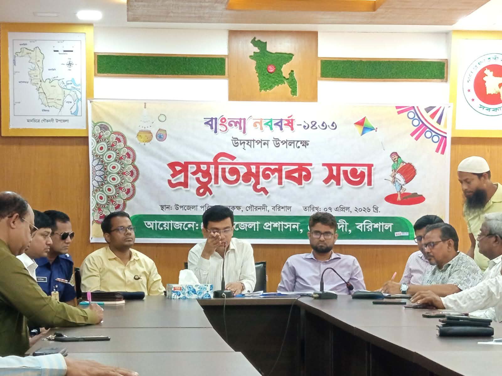 "এসো হে বৈশাখ এসো হে" শুভ বাংলা নববর্ষ - ১৪৩৩ উদযাপন উপলক্ষে বরিশালের গৌরনদীতে প্রস্তুতিমূলক সভা মঙ্গলবার ৭ এপ্রিল ২০২৬ সকাল ১০টায় উপজেলা পরিষদ সভাকক্ষে অনুষ্ঠিত হয়েছে।