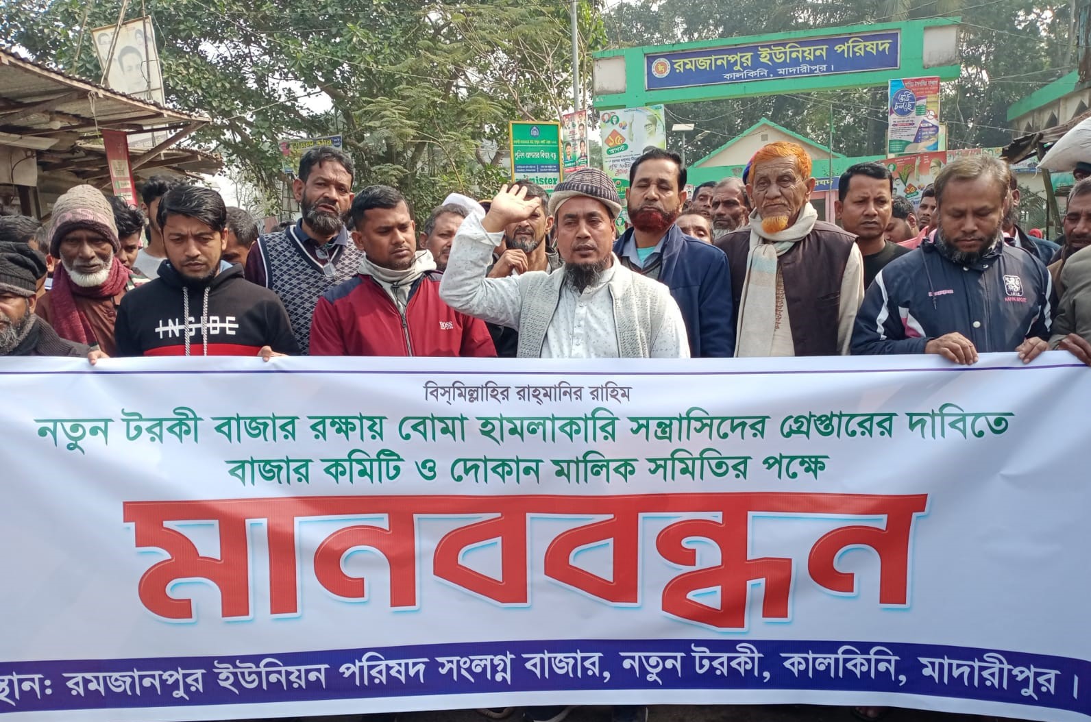 মাদারীপুরের কালকিনি উপজেলার রমজানপুর ইউনিয়নে বোমাবাজ সন্ত্রাসীদের গ্রেপ্তারের দাবিতে ব্যবসায়ী ও দোকান মালিক সমিতি মানববন্ধন কর্মসূচি পালন করেন। মঙ্গলবার (২১ জানুয়ারি) সকালে উপজেলার রমজানপুর ইউনিয়ন পরিষদের সামনে নতুন টরকী বাজারের ব্যবসায়ী ও দোকান মালিক সমিতির পক্ষ থেকে ঘন্টা ব্যাপী এ মানববন্ধন অনুষ্ঠিত হয়।