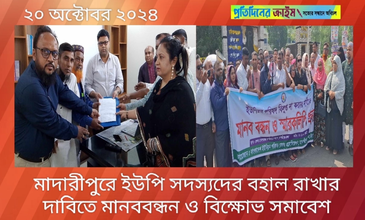 মো. হেমায়েত হোসেন খান,নিউজ ডেক্স প্রতিদিনের ক্রাইমঃ- ইউনিয়ন পরিষদের ইউপি সদস্য ও সংরক্ষিত মহিলা সদস্যগণকে অপসারণ না করার দাবিতে মাদারীপুরে মানব বন্ধন ও বিক্ষোভ সমাবেশ অনুষ্ঠিত হয়েছে। এষময় ইউপি সদস্যরা জেলা প্রশাসক বরাবর স্মারকলিপি প্রদান করেন।