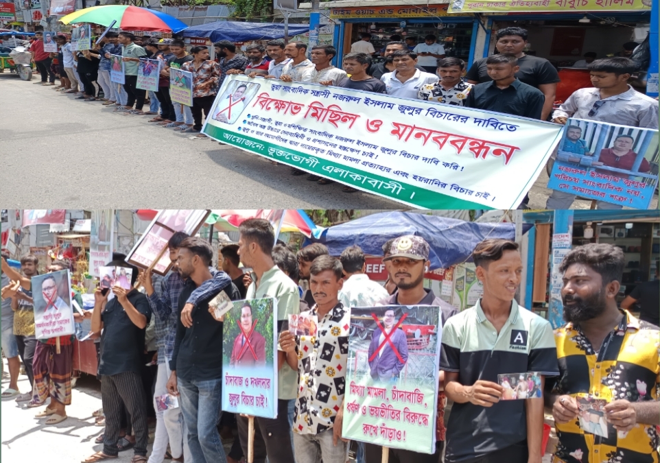 স্টাফ রিপোর্টারঃ- রাজশাহীতে কথিত ভুয়া সাংবাদিক, সন্ত্রাসী ও রাজশাহী প্রেসক্লাবের দখলদার সভাপতি নজরুল ইসলাম জুলুর বিচারের দাবিতে বিক্ষোভ মিছিল ও মানববন্ধন অনুষ্ঠিত হয়েছে। সোমবার (৭ জুলাই ২০২৫) সকাল ১১টা ৩০ মিনিট থেকে দুপুর ১২টা পর্যন্ত রাজশাহী মহানগরীর সাহেববাজার জিরো পয়েন্টে টিকাপাড়া খুলিপাড়া এলাকার ভুক্তভোগী এলাকাবাসীর ব্যানারে এ কর্মসূচি পালিত হয়।