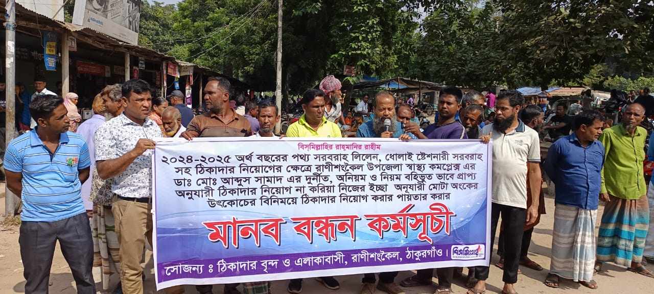 আবুল কালাম আজাদ (ঠাকুরগাঁও) রানীশংকৈল প্রতিনিধিঃ- ঠাকুরগাঁওয়ের রানীশংকৈল উপজেলার স্বাস্থ্য কমপ্লেক্সে ২০২৪-২০২৫ অর্থ বছরে পন্য সরবরাহ, স্টেশনারী সরবরাহ ও লিলেন ধোলাই এর ঠিকাদার নিয়োগে অনিয়ম দুর্নীতির অভিযোগে ঠিকাদার গন ডাক্তার আব্দুস সামাদ চৌধুরী এর বিরুদ্ধে উপজেলা গেটে দুপুর ১২ টায় মানববন্ধন করেছেন।