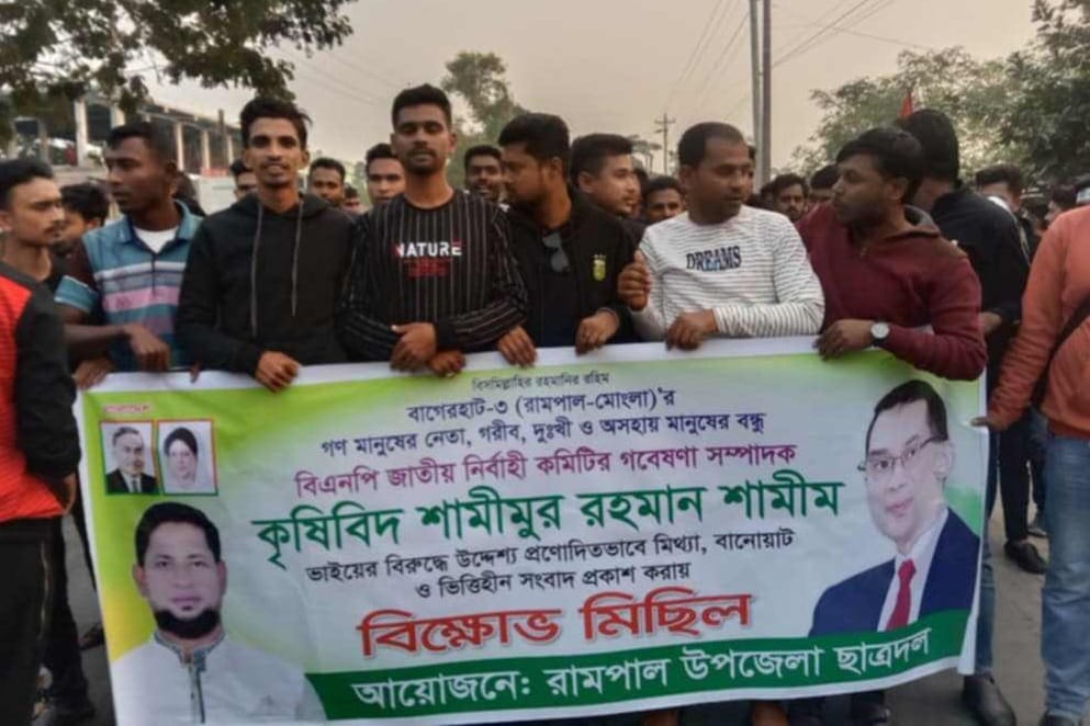 বাগেরহাটের রামপালে বাংলাদেশ জাতীয়তাবাদী দল বিএনপি’র জাতীয় নির্বাহী কমিটির গবেষণা বিষয়ক সম্পাদক কৃষিবিদ শামীমুর রহমান (শামীম)’র বিরুদ্ধে চ্যানেল২৪ টেলিভিশনে মিথ্যা, বানোয়াট ও ভিত্তিহীন সংবাদ প্রকাশের প্রতিবাদে বিক্ষোভ মিছিল করেছে উপজেলা ছাত্রদল।