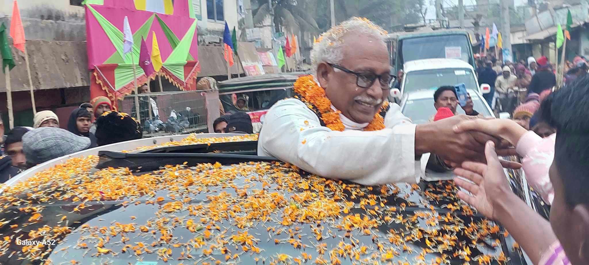 তাকে বরণ করে নিতে অভিনন্দন জানিয়ে সড়ক জুড়ে নির্মাণ করা হয়েছে একাধীক তোরণ।