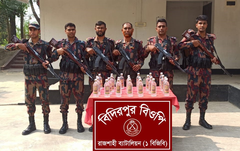রাজশাহীর সীমান্তবর্তী এলাকায় মাদকবিরোধী বিশেষ অভিযানে ২৫ বোতল ভারতীয় মদ জব্দ করেছে রাজশাহী ব্যাটালিয়ন (১ বিজিবি)। রোববার (৮ মার্চ ) ভোররাতে গোদাগাড়ী থানাধীন হরিসংকরপুর সীমান্ত এলাকায় এই অভিযান পরিচালিত হয়। তবে বিজিবি সদস্যদের উপস্থিতি টের পেয়ে মালামাল ফেলে অন্ধকারের সুযোগে পালিয়ে যেতে সক্ষম হয়েছে এক মাদক কারবারী।
