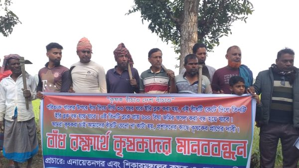 আশরাফুর রহমান হাকিম নিজস্ব প্রতিবেদক : মাদারীপুরের কালকিনি উপজেলার শিকারমঙ্গল ও এনায়েতনগর ইউনিয়নের মাঝেরকান্দি নুরুল হক বয়াতীর বাড়ির সামনে খালের মধ্যে ৩৫ বছরের পুরনো বাঁধ রক্ষার্থে শত-শত কৃষকদের মানববন্ধন। সোমবার
