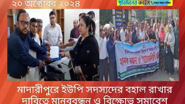 মো. হেমায়েত হোসেন খান,নিউজ ডেক্স প্রতিদিনের ক্রাইমঃ- ইউনিয়ন পরিষদের ইউপি সদস্য ও সংরক্ষিত মহিলা সদস্যগণকে অপসারণ না করার দাবিতে মাদারীপুরে মানব বন্ধন ও বিক্ষোভ সমাবেশ অনুষ্ঠিত হয়েছে। এষময় ইউপি সদস্যরা