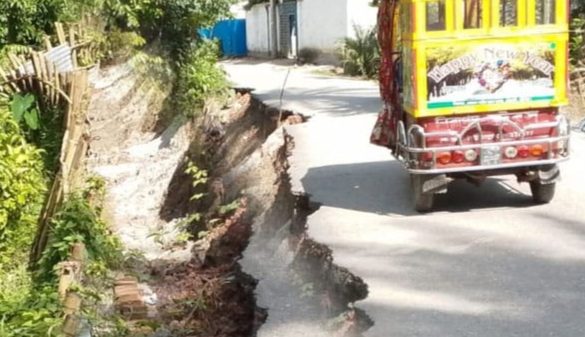 গৌরনদীতে সড়ক ধসে জীবনের ঝুঁকি নিয়ে চলছে যানবাহন
