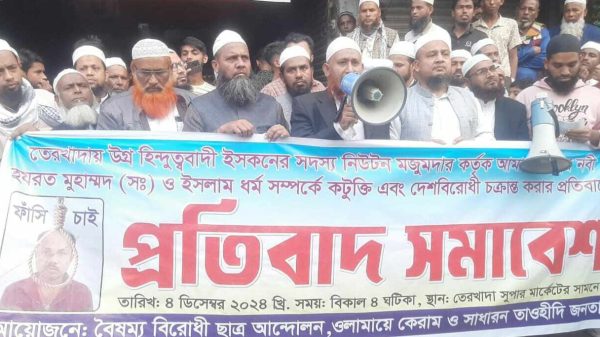 সাগর, তেরখাদা প্রতিনিধি , খুলনা // বৈষম্য বিরোধী ছাত্র আন্দোলন , ওলামায়ে কেরাম ও তৌহিদী জনতার উদ্যোগে ৪ ঠা ডিসেম্বর ~২০২৪ ইংরেজি বুধবার হিন্দুত্ববাদী ইসকনের সদস্য নিউটন মজুমদার কর্তৃক